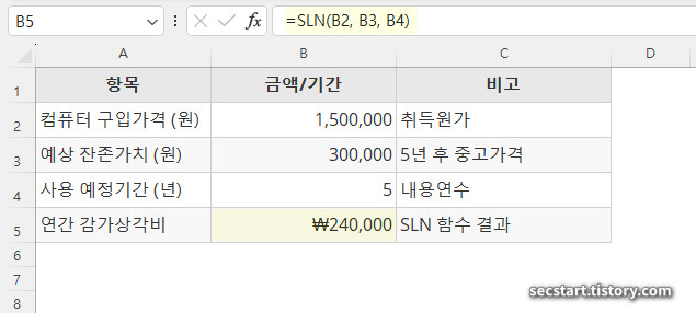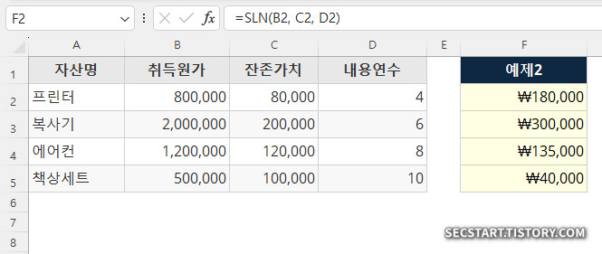 - 구문: =SLN(취득원가, 잔존가치, 내용연수)
