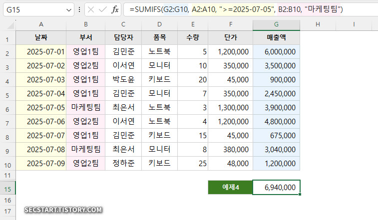 =SUMIFS(G2:G10, A2:A10, ">=2025-07-05", B2:B10, "마케팅팀")