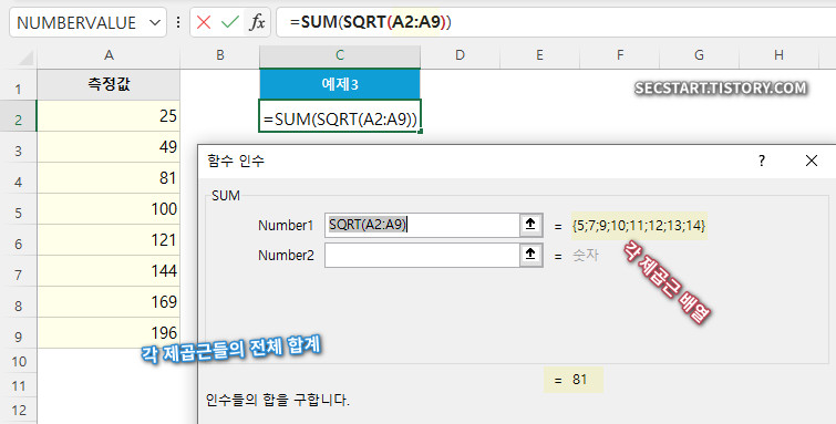 만약 여러 숫자들의 제곱근을 구한 뒤, 그 값들의 합계를 내야 한다면 어떻게 할까요? 각 숫자의 제곱근을 구하고 다시 SUM 함수를 쓰는 대신, 배열 수식을 이용하면 한 번에 해결할 수 있어요!