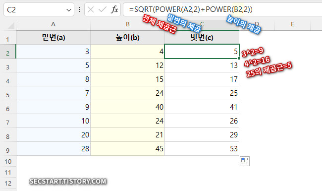 - 피타고라스 정리: =SQRT(POWER(A2,2)+POWER(B2,2))