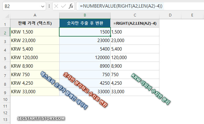 RIGHT(A2,LEN(A2)-4) 수식은 "KRW " 라는 4글자를 제외한 오른쪽 부분(숫자)만 가져오라는 의미예요. 그 결과를 NUMBERVALUE가 숫자로 바꿔주는 거죠!