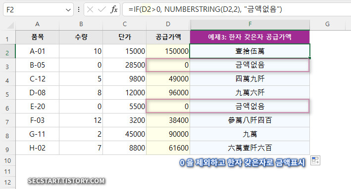 =IF(D2>0, NUMBERSTRING(D2, 1), "금액 없음")