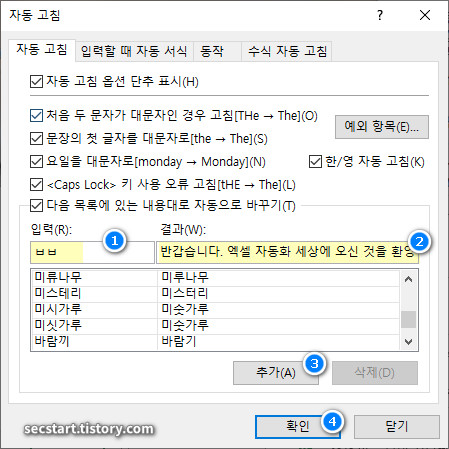 - 결과(W): 약어를 입력했을 때 나타날 긴 문장 (예: 반갑습니다. 엑셀 자동화 세상에 오신 것을 환영합니다.)