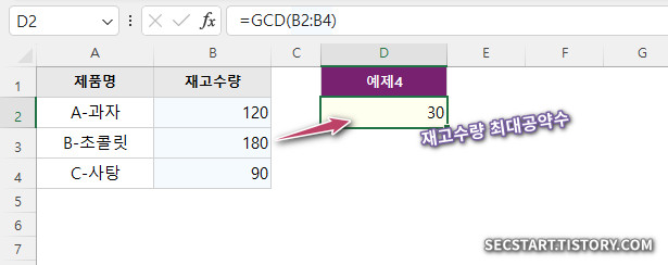 자, 이제 실무에서 정말 유용하게 쓸 수 있는 팁이에요! 창고에 여러 종류의 제품 재고가 있을 때, 모든 제품을 남김없이 담을 수 있는 가장 큰 포장 단위(Box)는 몇 개일까요? 이럴 때 GCD 함수가 빛을 발합니다. 🚀