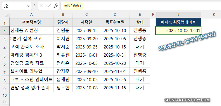 여러 사람이 함께 작업하는 파일이라면, 누가 언제 마지막으로 수정했는지 기록을 남기는 것이 중요하죠. NOW 함수로 간단하게 해결할 수 있습니다.