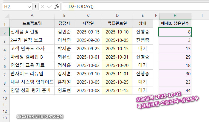 결과: H2 셀에 8 이 표시됩니다. (목표완료일 2025-10-10 - 오늘 2025-10-02)