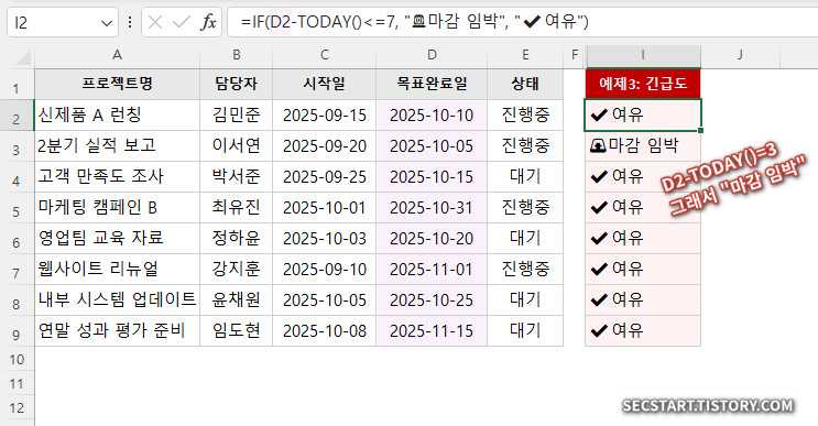 예제 3 (고급): 마감 임박 프로젝트 자동 표시하기 (IF 함수 조합)