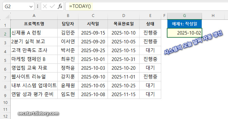 결과: G2 셀에 2025-10-02 이 표시됩니다. (이 문서는 내일 열면 2025-10-03 로 자동 변경돼요!)