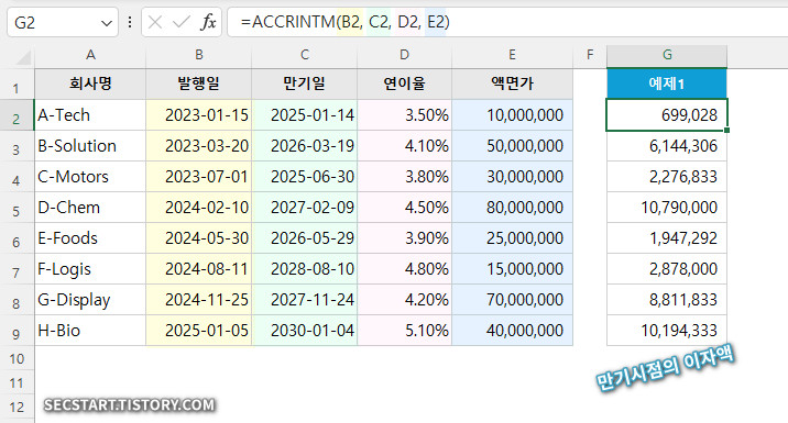 백문이 불여일견이죠! 실제 업무에서 마주할 법한 예제로 ACCRINTM 함수를 직접 사용해봐요.