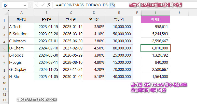 설명: 만기일(C5) 대신 TODAY() 함수를 settlement 인수에 넣었어요. 이렇게 하면 엑셀 파일을 열 때마다 오늘 날짜를 기준으로 미경과이자를 자동으로 다시 계산해 주어 무척 편리하답니다!