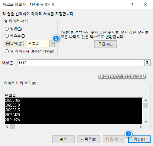 - [날짜] 서식 선택 > 원본 형식 [년월일] 선택 > [마침]