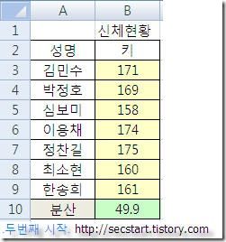 문제를 보면 키를 표본으로 하여 분산을 구합니다. 분산을 구하는 엑셀 함수인 VAR 이 필요하지요.