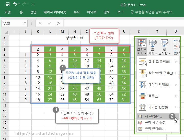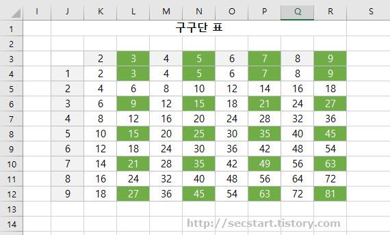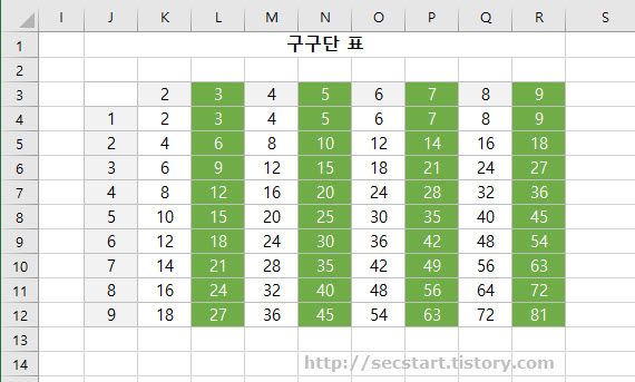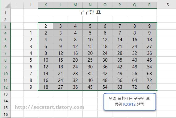 1. 먼저 서식이 적용될 범위를 선택한다. 위에서는 구구단의 단을 포함하는 K3:R12 의 범위이다.