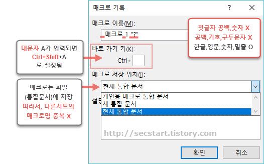 엑셀 매크로는 작성시 선택하는 '매크로 위치' 에 저장된다. [그림1 참고] 이렇게 매크로 저장 위치가 달라짐에 따라 매크로가 실행되는 범위와 방법이 달라지기 때문이다.