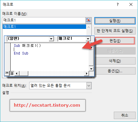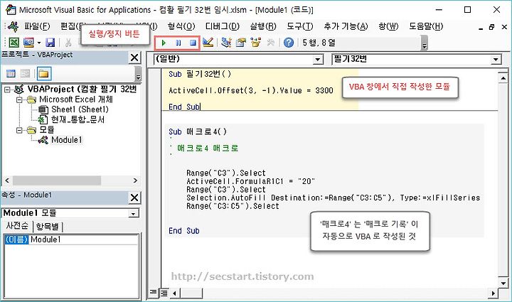 따라서, 하나의 매크로는 Sub 로 시작하고 End Sub 로 종료하는 비주얼베이직 모듈이다. 매크로명은 이 모듈에 붙여진 이름인 것이다. 모든 엑셀 작업 기록이 이렇게 비주얼베이직 스크립트( 함수, 명령어 )로 기록되고 저장된다.